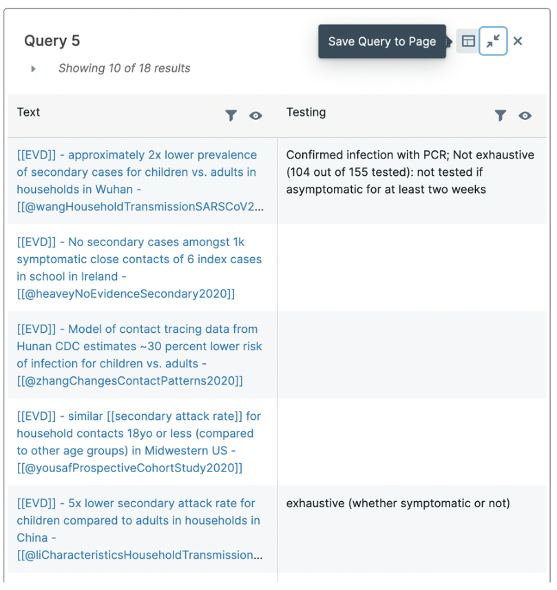 Example: find all evidence that informs a question, and select a methods attribute to display so we can sort/filter on it (this example assumes at least some evidence pages have an attribute testingRegime:: in them)